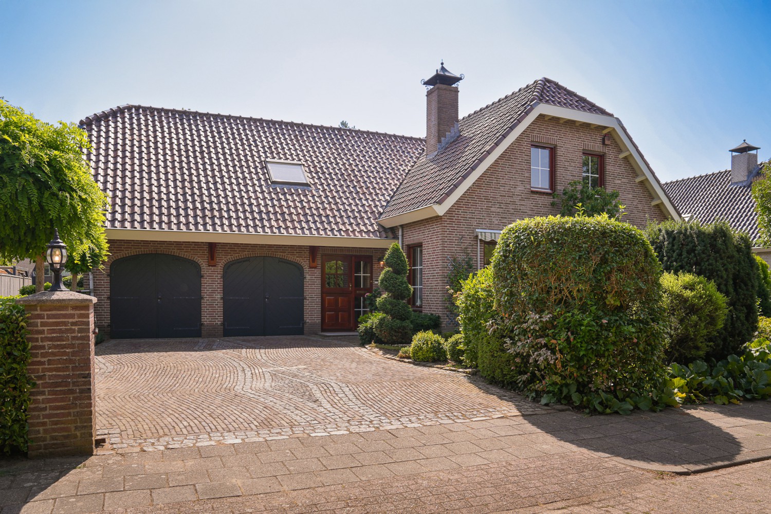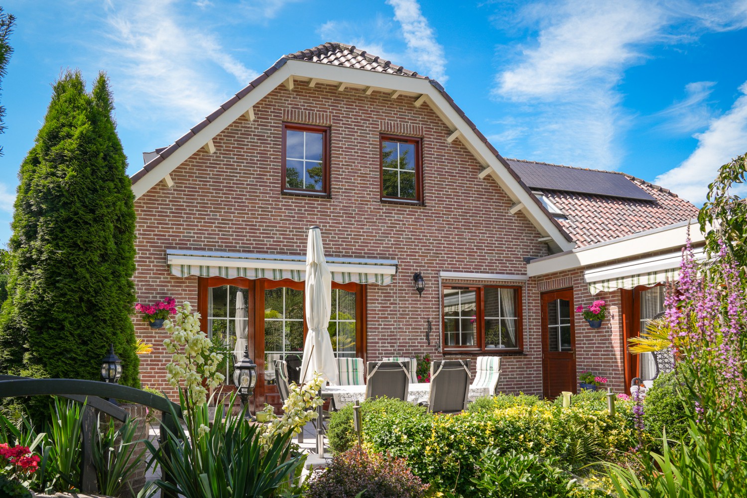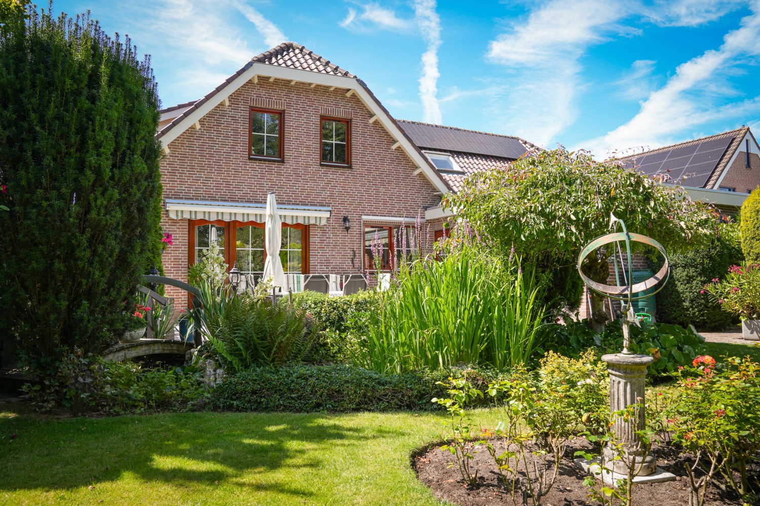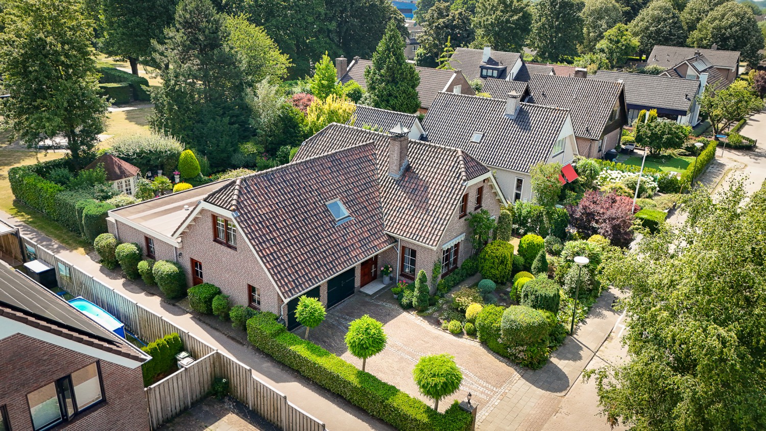 Een tikje robuust ligt deze villa uit 1992 aan een doodlopende straat. De vriendelijke gevels harmoniëren fraai met het samengestelde dak, dat het huis als een warme deken omhult. Rust kenmerkt de omgeving, aan de achterzijde ligt deze woning vrij. De hoogwaardige bouwkwaliteit komt ook terug in het interieur. De zandstenen schouw met houtkachel komt fraai tot zijn recht in de verrassend ruime woonkamer. Over het ontwerp van de villa is destijds goed nagedacht, wat heeft geleidt tot een prettige en praktisch woonhuis. Comfort en ruimte kenmerken deze villa. Op de begane grond is een slaapkamer met badkamer en op de verdieping zijn vier slaapkamers, een badkamer en separaat toilet. In de achtertuin, half verscholen in het groen, staat een romantisch tuinhuisje. Het gazon in de tuin leidt als een groene loper langs alle mooie plekjes. Prachtige borders met volgroeide planten, een vijver en een terras. Hier geniet u van het buitenleven pur sang.