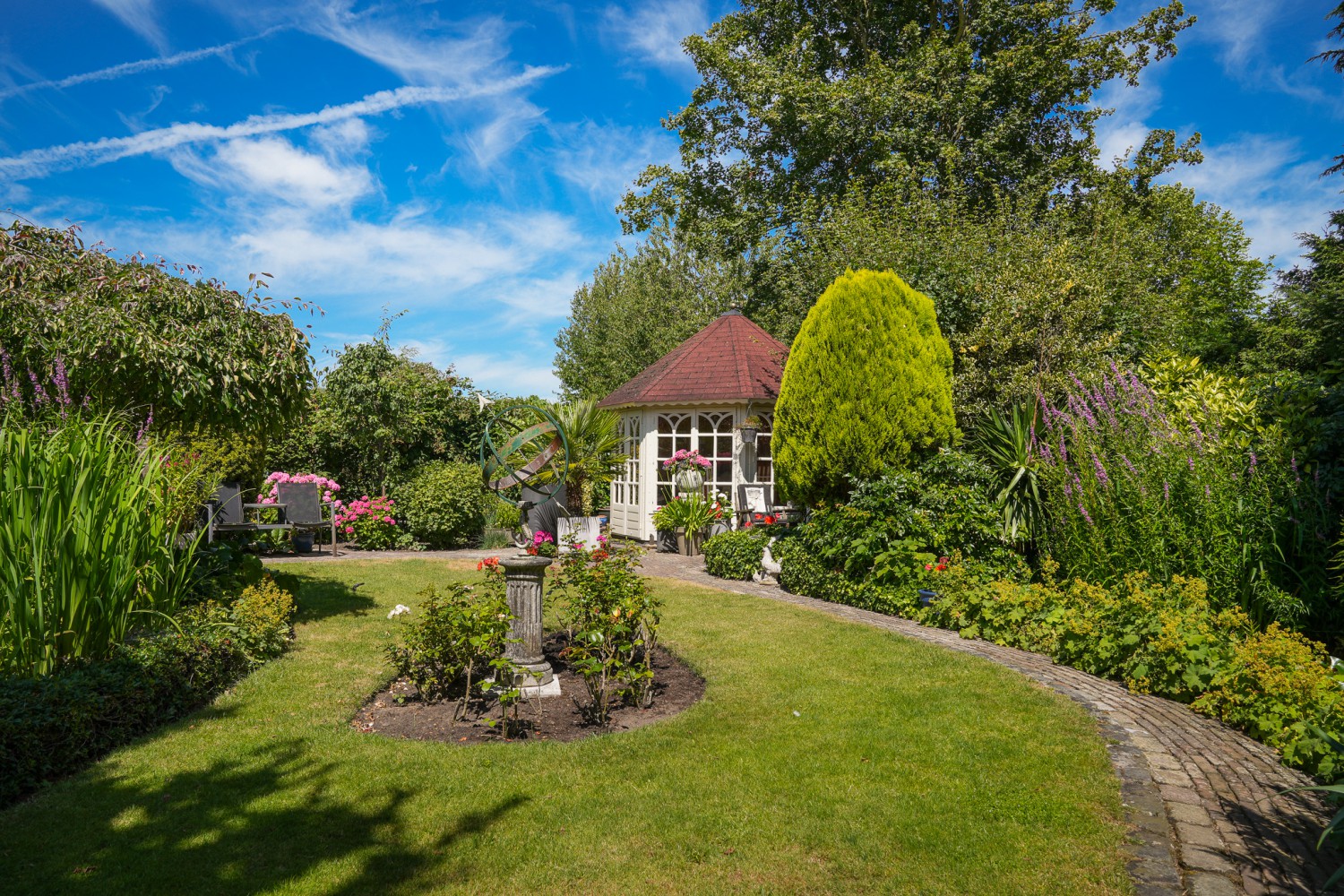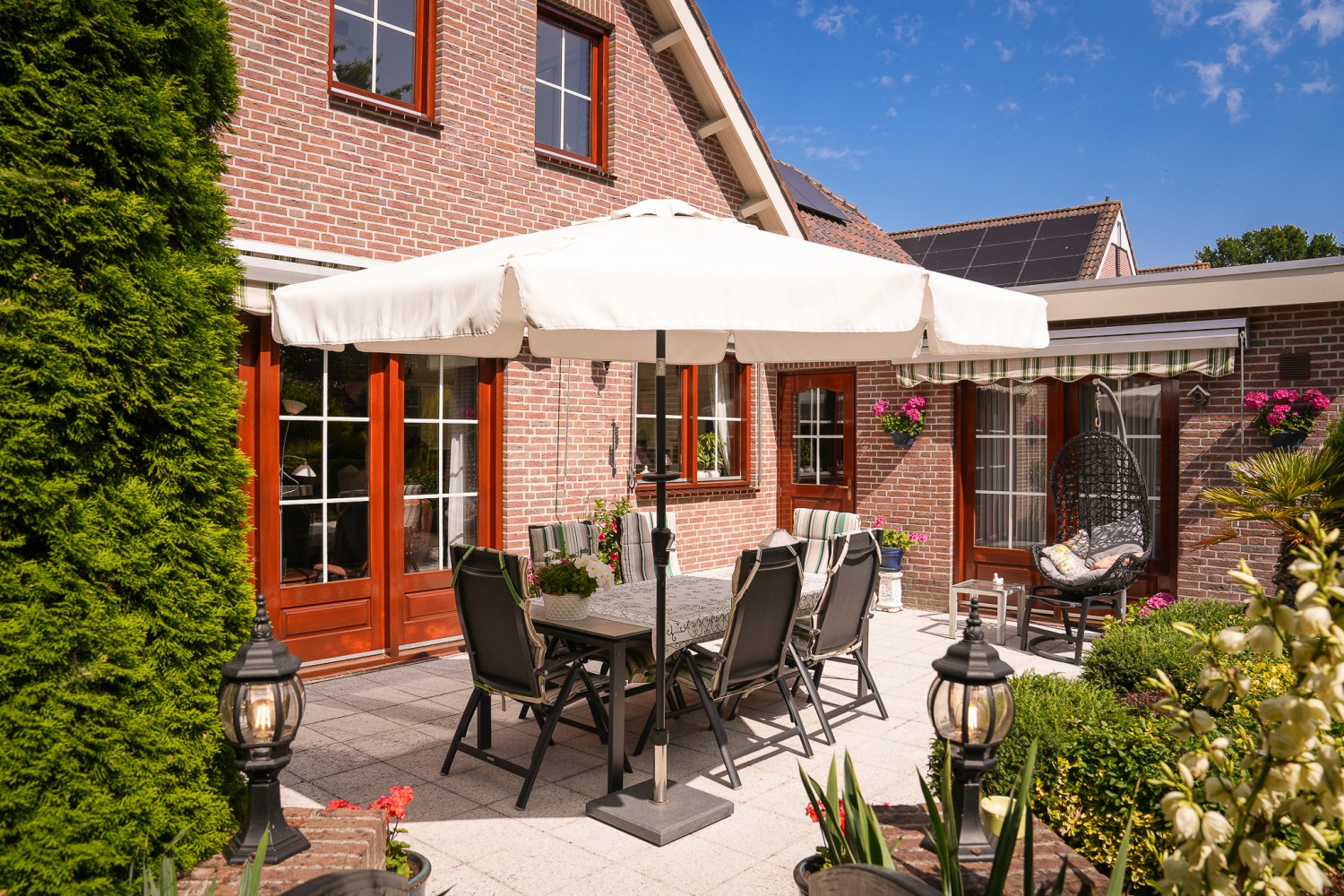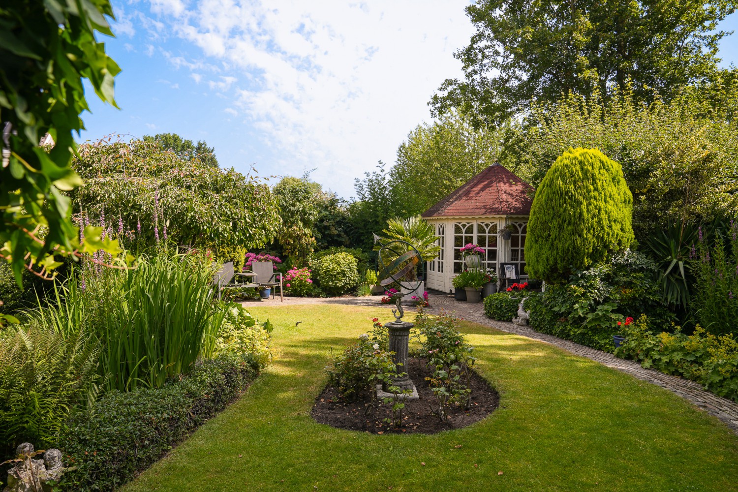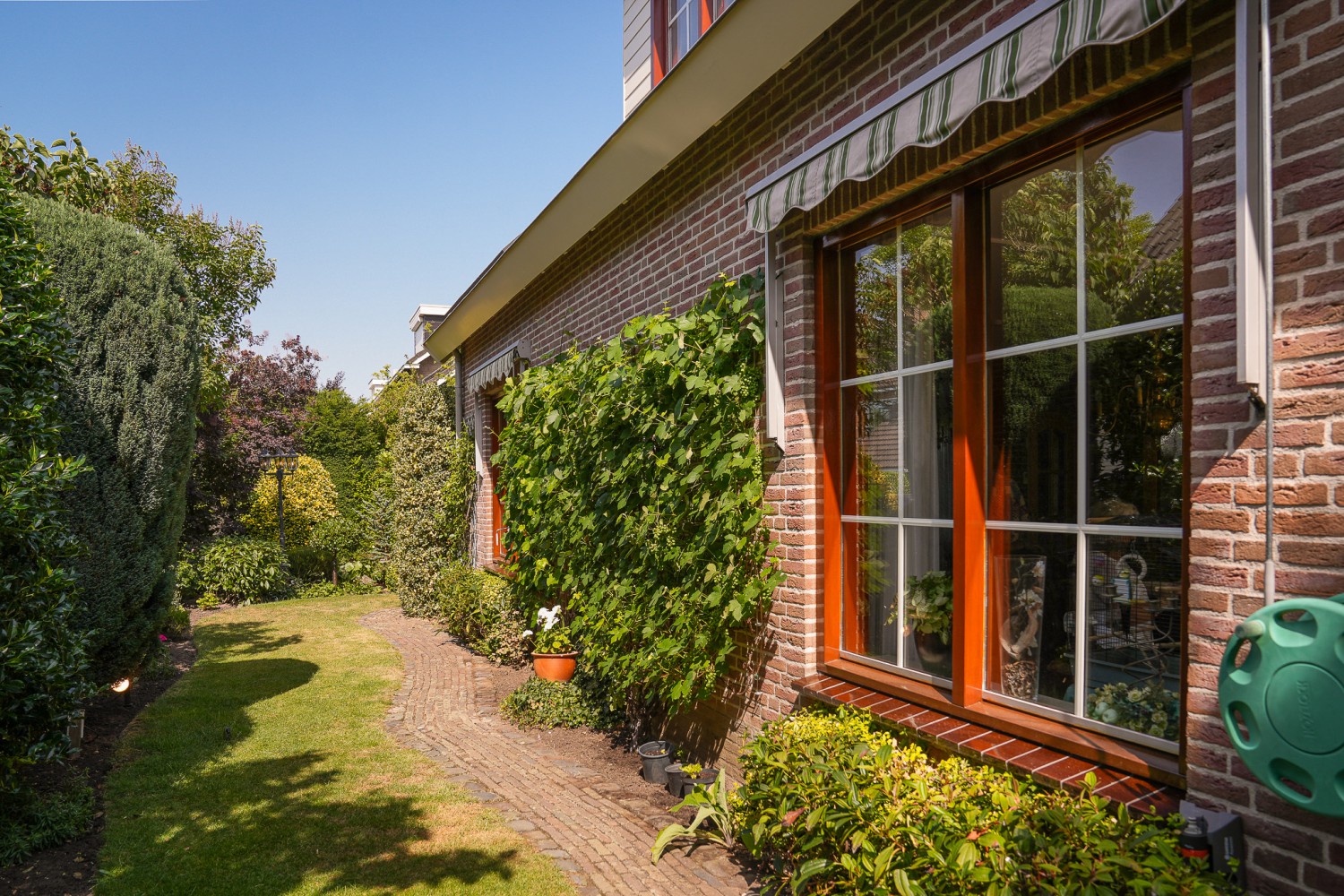 Een tikje robuust ligt deze villa uit 1992 aan een doodlopende straat. De vriendelijke gevels harmoniëren fraai met het samengestelde dak, dat het huis als een warme deken omhult. Rust kenmerkt de omgeving, aan de achterzijde ligt deze woning vrij. De hoogwaardige bouwkwaliteit komt ook terug in het interieur. De zandstenen schouw met houtkachel komt fraai tot zijn recht in de verrassend ruime woonkamer. Over het ontwerp van de villa is destijds goed nagedacht, wat heeft geleidt tot een prettige en praktisch woonhuis. Comfort en ruimte kenmerken deze villa. Op de begane grond is een slaapkamer met badkamer en op de verdieping zijn vier slaapkamers, een badkamer en separaat toilet. In de achtertuin, half verscholen in het groen, staat een romantisch tuinhuisje. Het gazon in de tuin leidt als een groene loper langs alle mooie plekjes. Prachtige borders met volgroeide planten, een vijver en een terras. Hier geniet u van het buitenleven pur sang.