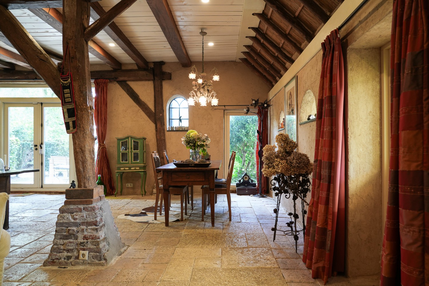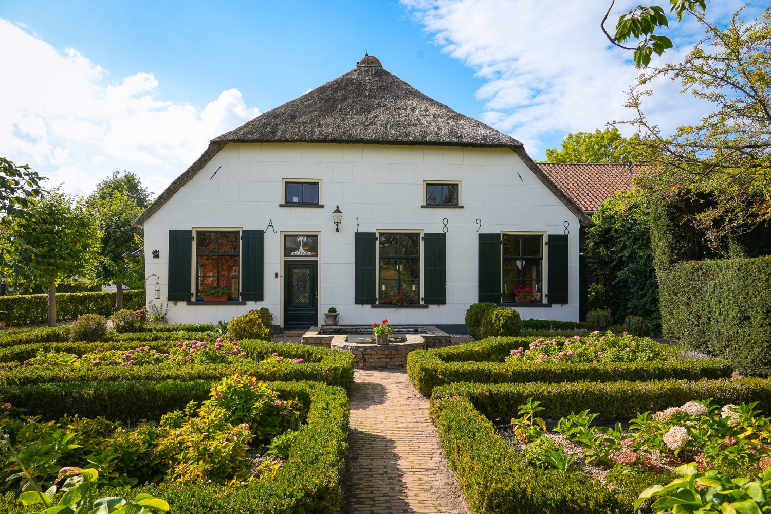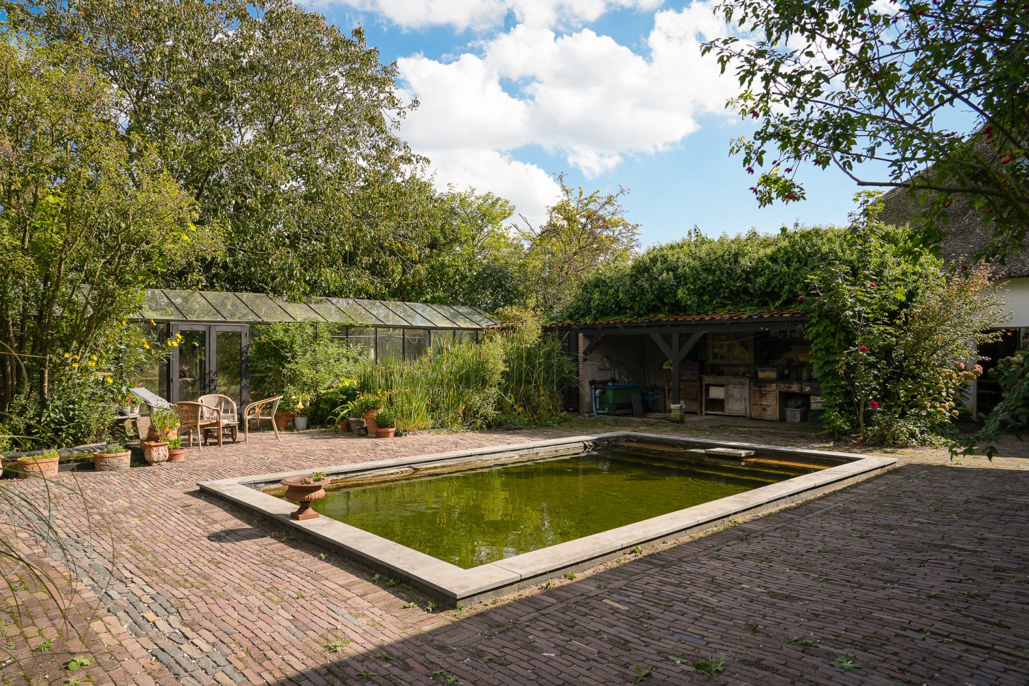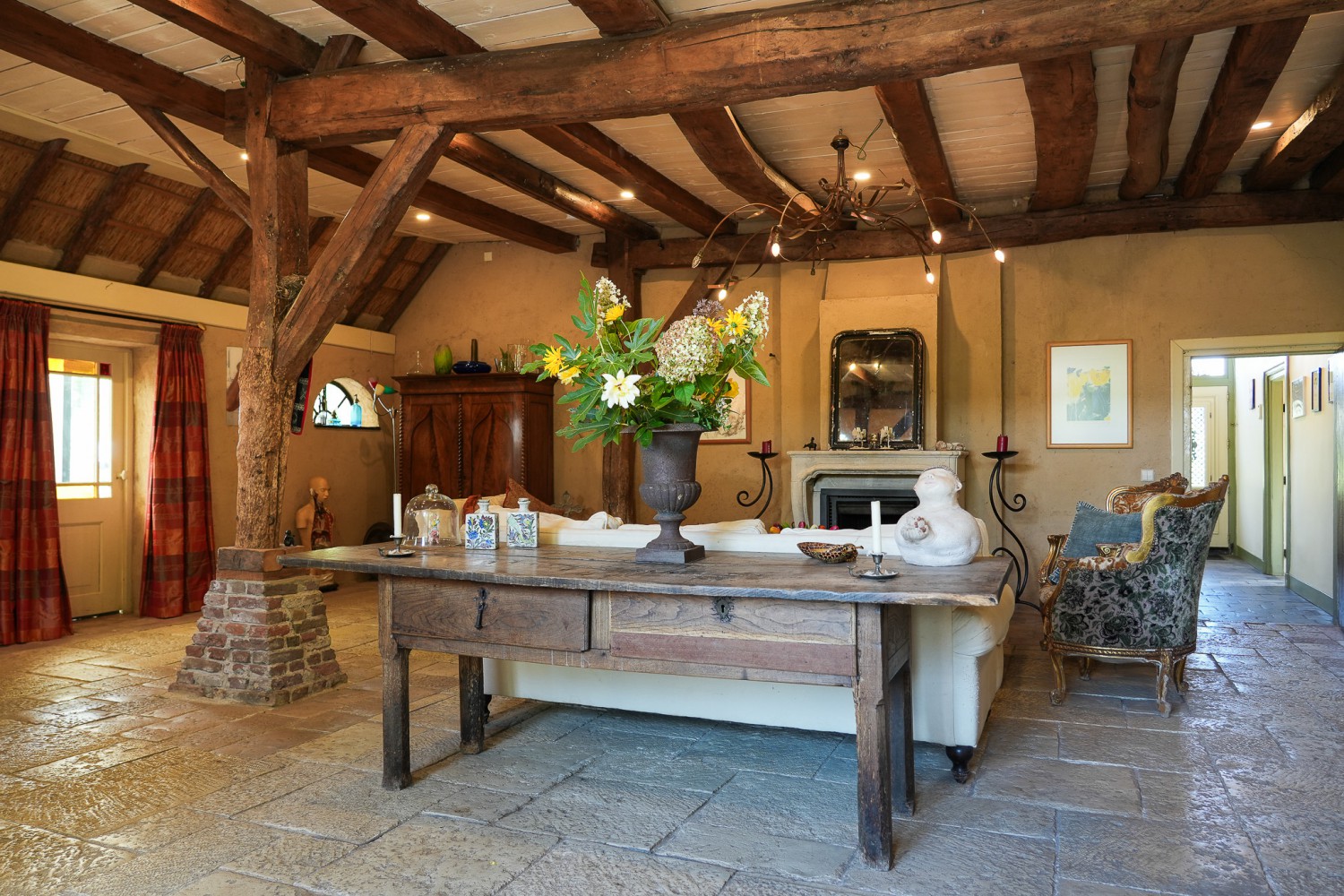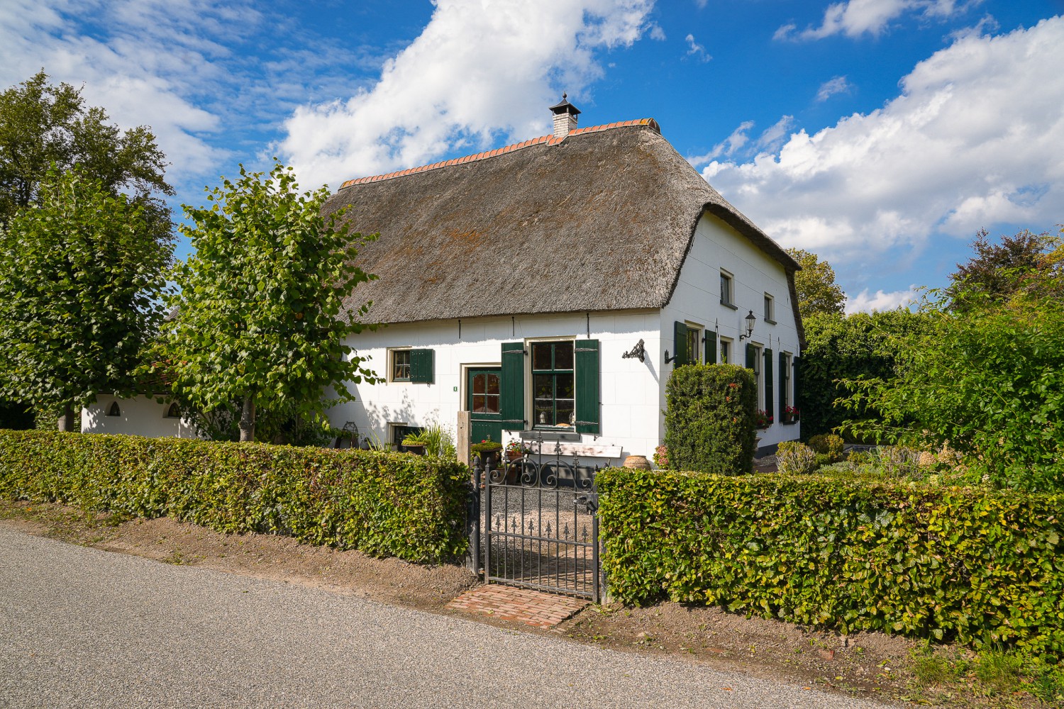 Als een warme deken omhult het rieten dak deze hoeve uit de 17e eeuw. De witte gevel en de groene luiken maken het sprookjesachtige tafereel in de landelijke omgeving compleet. De fijne tuin met zwemvijver, grote kas en boomgaard dragen bij aan de natuurlijke uitstraling van dit rijksmonument. In het interieur zijn veel oude details prachtig verweven met hedendaags comfort. In de woonkeuken ademt de sfeer van weleer door de roodstenen varkenstrog en hardstenen pompbak die in gebruik zijn als spoelbak. De zitvensterbanken verleiden tot gezellig chillen in de woonkeuken. De living is ruim en intiem. De zichtbare gebinten harmoniseren fraai met de balken aan het plafond. De warmte van de met leem gestucte wanden en de zandstenen schouw met houthaard zijn een open uitnodiging om heerlijk te ontspannen. Direct achter de living is de binnendoorgang naar het grote bijgebouw gesitueerd. Gerieflijkheid kenmerkt ook de verdieping waar beide slaapkamers over een badkamer-en-suite beschikken. De ambiance van de royale slaapkamer aan de achterzijde met open nok en bekleding van sierriet is ronduit bijzonder.