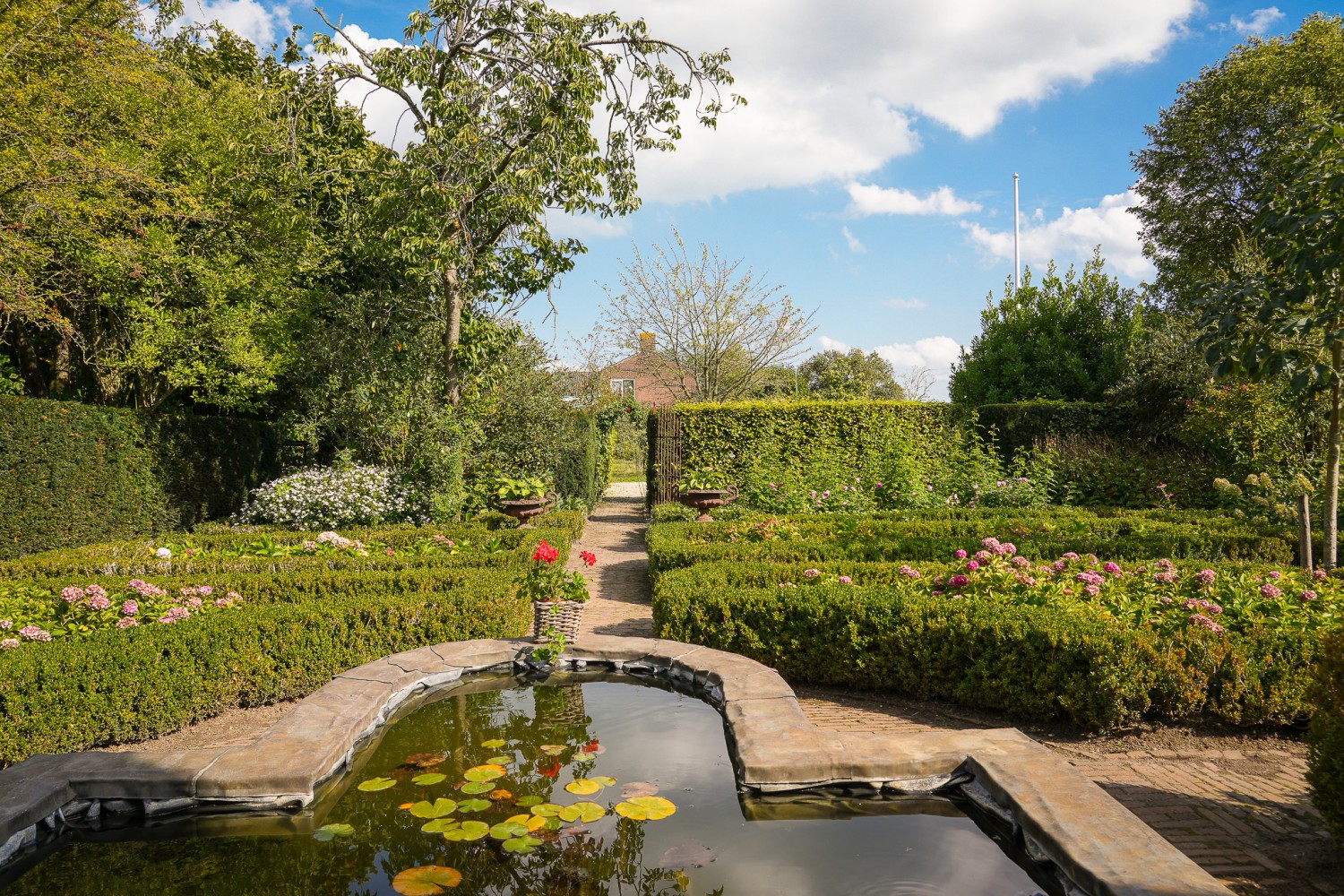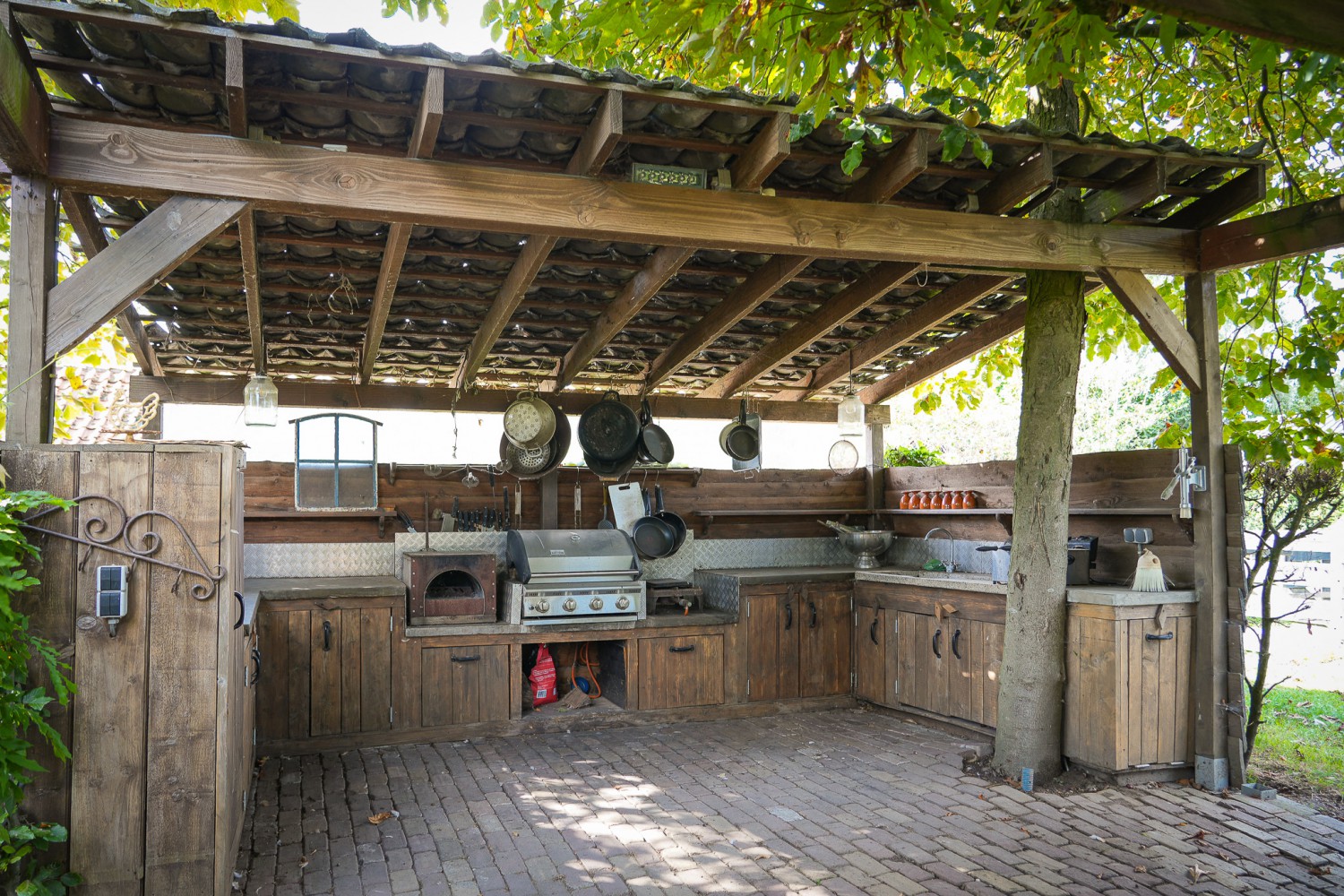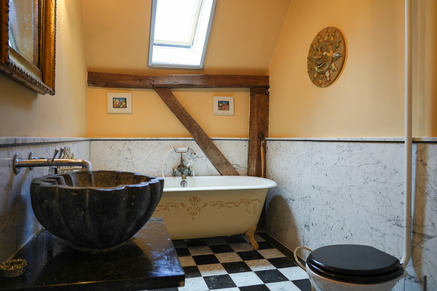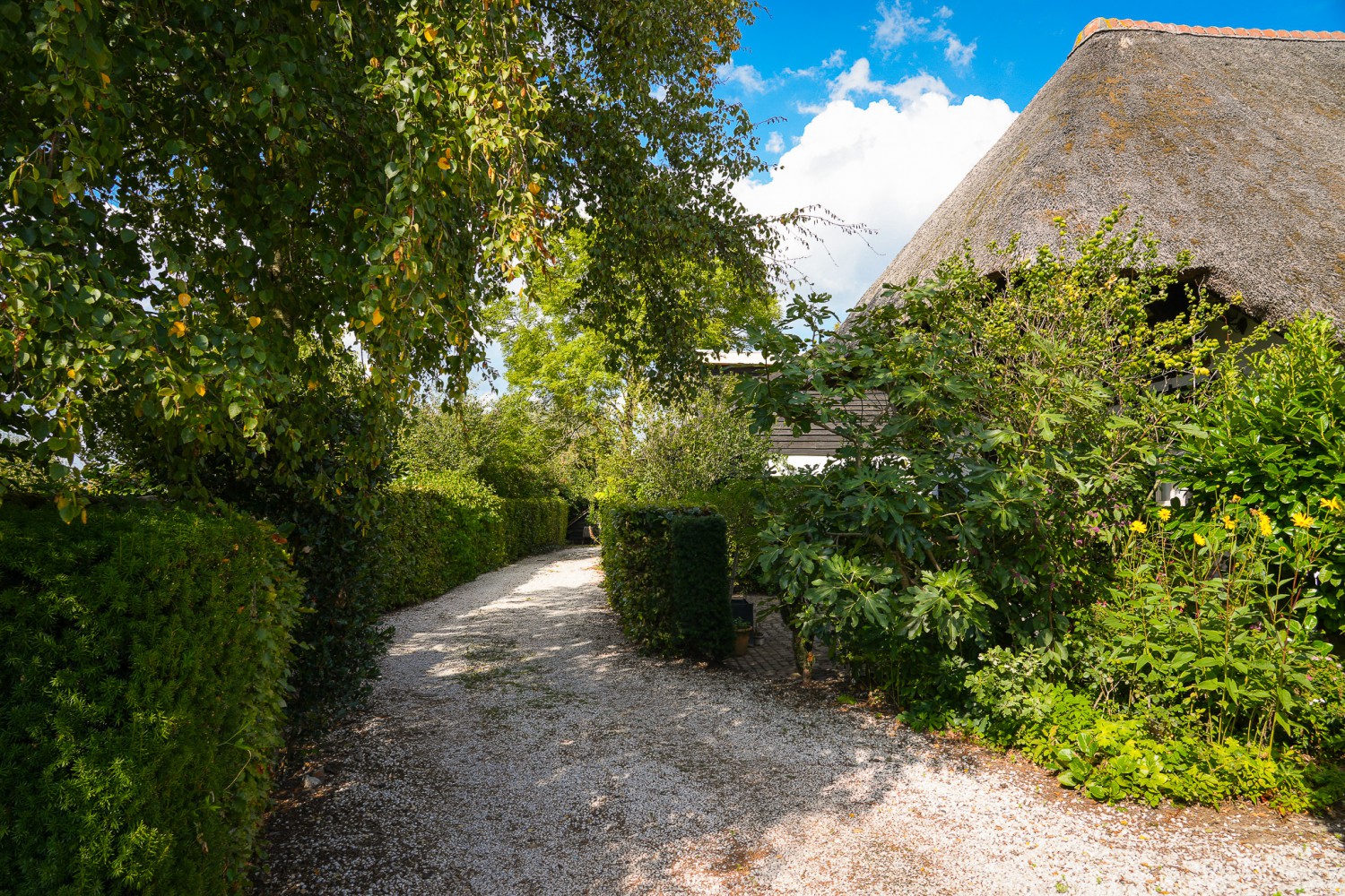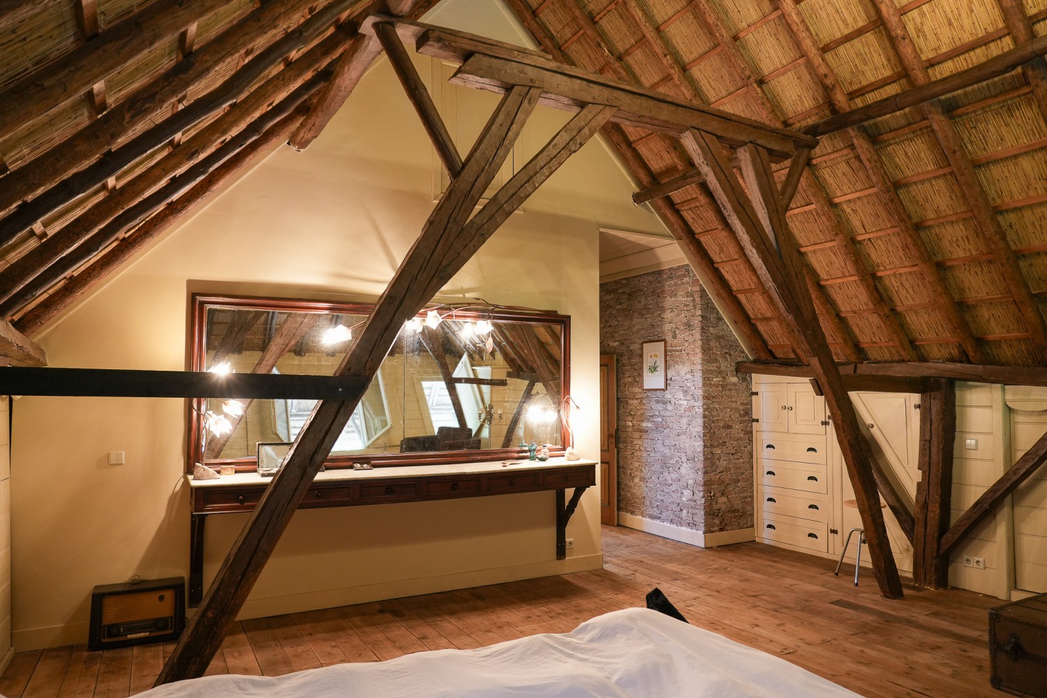 Als een warme deken omhult het rieten dak deze hoeve uit de 17e eeuw. De witte gevel en de groene luiken maken het sprookjesachtige tafereel in de landelijke omgeving compleet. De fijne tuin met zwemvijver, grote kas en boomgaard dragen bij aan de natuurlijke uitstraling van dit rijksmonument. In het interieur zijn veel oude details prachtig verweven met hedendaags comfort. In de woonkeuken ademt de sfeer van weleer door de roodstenen varkenstrog en hardstenen pompbak die in gebruik zijn als spoelbak. De zitvensterbanken verleiden tot gezellig chillen in de woonkeuken. De living is ruim en intiem. De zichtbare gebinten harmoniseren fraai met de balken aan het plafond. De warmte van de met leem gestucte wanden en de zandstenen schouw met houthaard zijn een open uitnodiging om heerlijk te ontspannen. Direct achter de living is de binnendoorgang naar het grote bijgebouw gesitueerd. Gerieflijkheid kenmerkt ook de verdieping waar beide slaapkamers over een badkamer-en-suite beschikken. De ambiance van de royale slaapkamer aan de achterzijde met open nok en bekleding van sierriet is ronduit bijzonder.