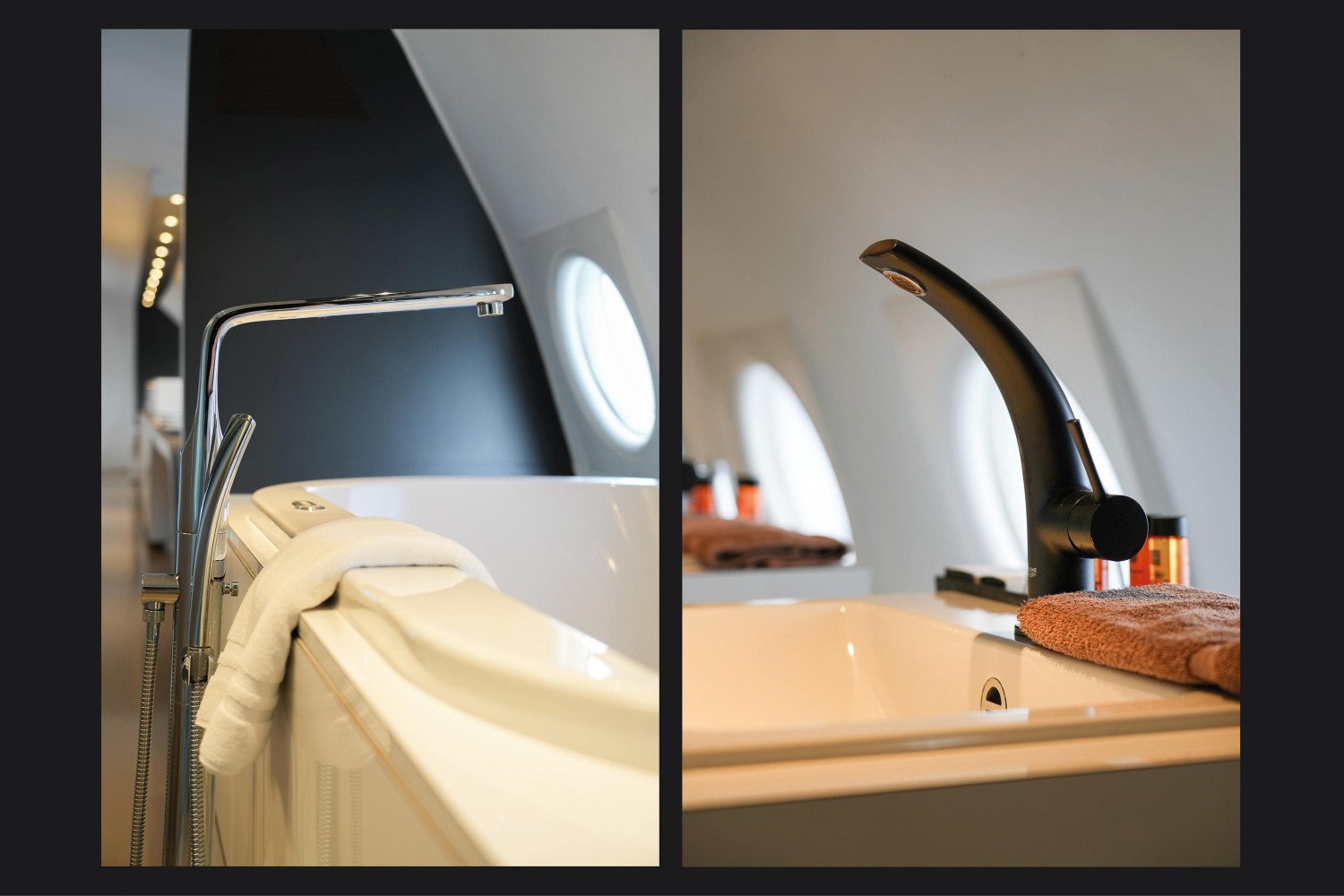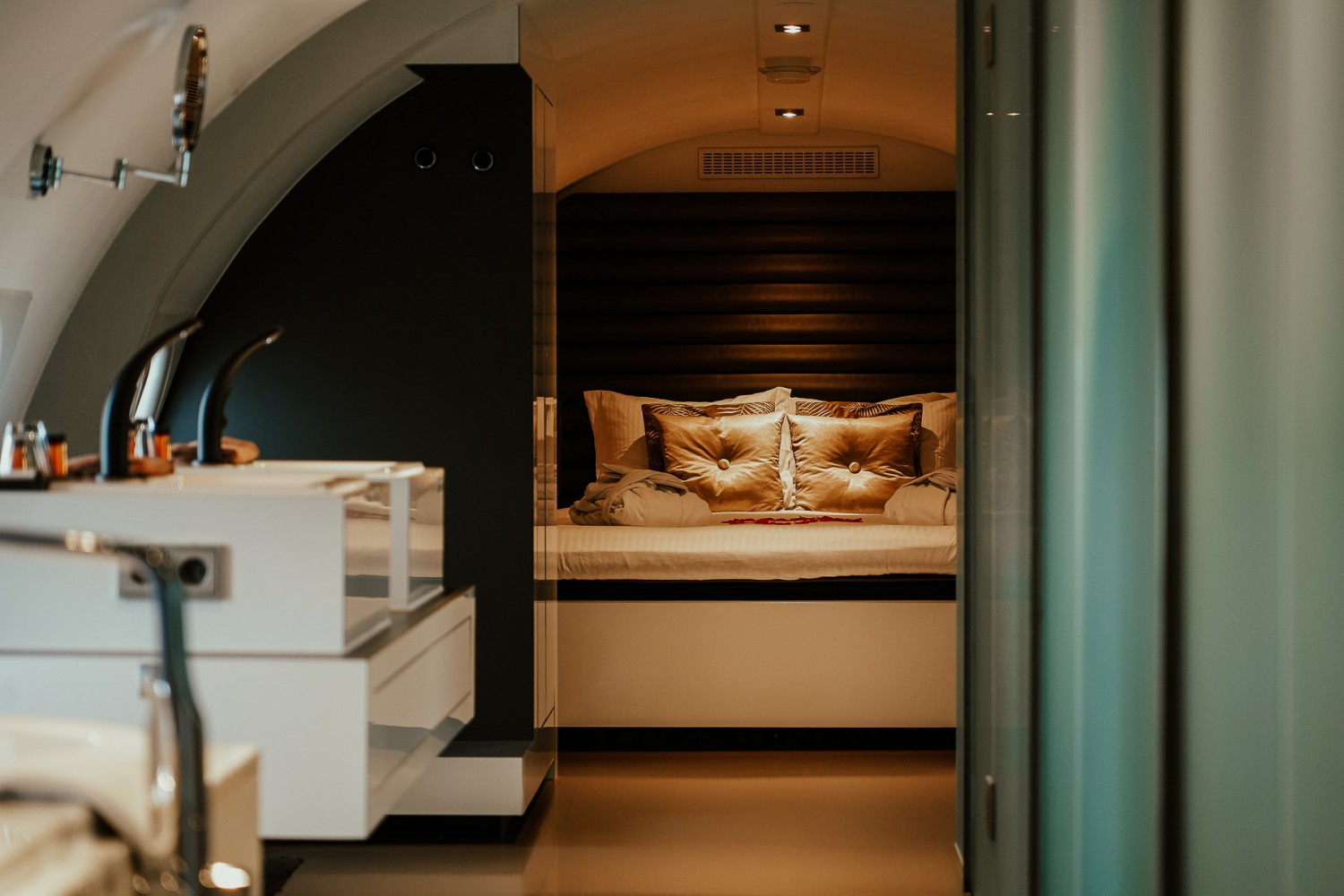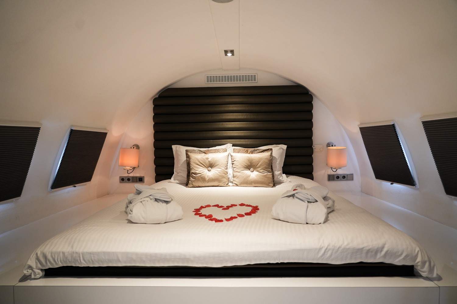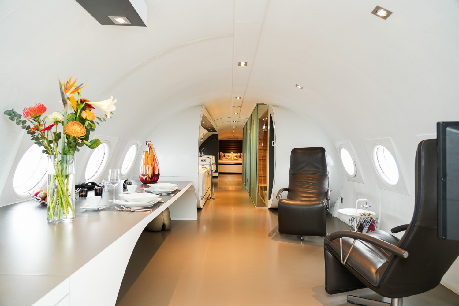 Met de koninklijke gratie van een krachtige roofvogel pronkt dit voormalige Oost-Duitse regeringstoestel op Teuge International Airport. Het toestel, een Ilyushin Il-18, werd gebouwd in 1960. Jarenlang doorkruiste het vliegtuig het luchtruim naar Cuba, Rusland en Vietnam om passagiers van de vroegere staatsluchtvaartmaatschappij Interflug te vervoeren. Daarna volgde een periode als restaurant in Duitsland. In 2009 belandde het vliegtuig in Nederland. Het werd omgebouwd tot een luxe suite voor een van de meest bijzondere hotelervaringen van Nederland. Inmiddels hebben al duizenden mensen een magische ‘slaapreis in de wolken’ beleefd. De hotelsuite heeft de afgelopen tien jaar een bezettingsgraad van 85 procent en is sinds 2021 ook een officiële trouwlocatie. Het is zelfs uitgeroepen tot ‘Beste Hotel van Nederland - Zoover Award Gold’, ‘Mooiste hotelkamer van Nederland’ en won de ‘Badkamer Design Award’. De gastenwaarderingen zijn bovengemiddeld hoog: 9,8 op Booking.com en 4,9 op Tripadvisor. Jan des Bouvrie, die destijds de officiële opening verrichtte, prees de zeldzame combinatie van historie en design. De originele cockpit is een ultieme dromenvanger. De jacuzzi en de infrarood-sauna verhogen de wellness-beleving. Het hoge terras aan de achterzijde biedt een first-class zicht op de dynamiek van landende sportvliegtuigen en parachutisten die het luchtruim gaan verkennen.