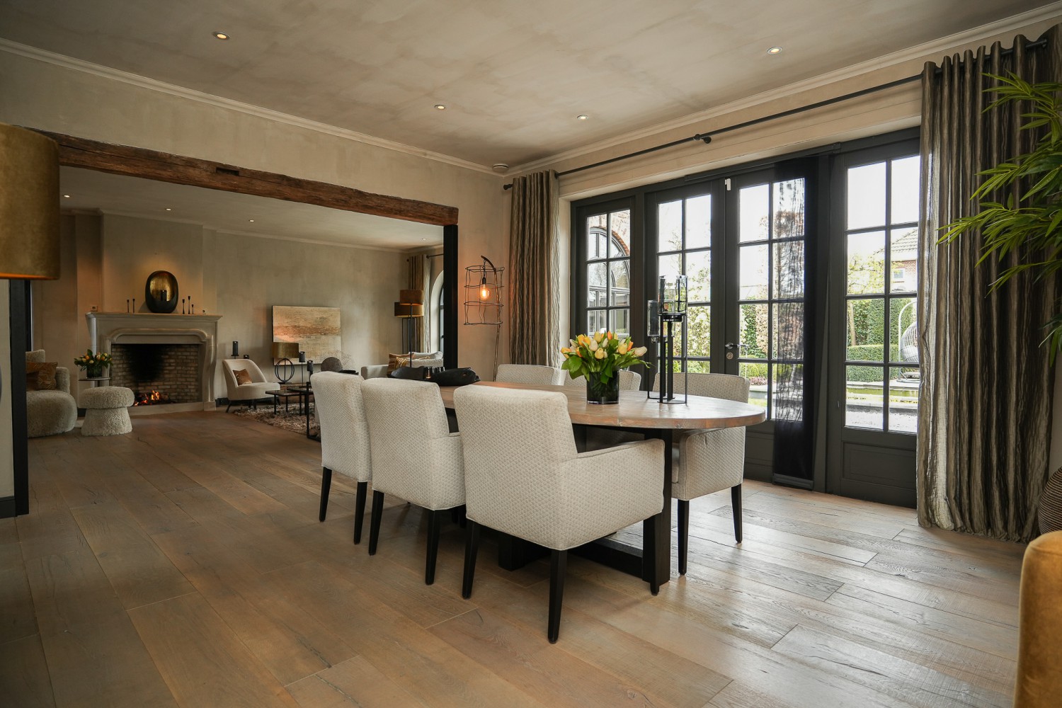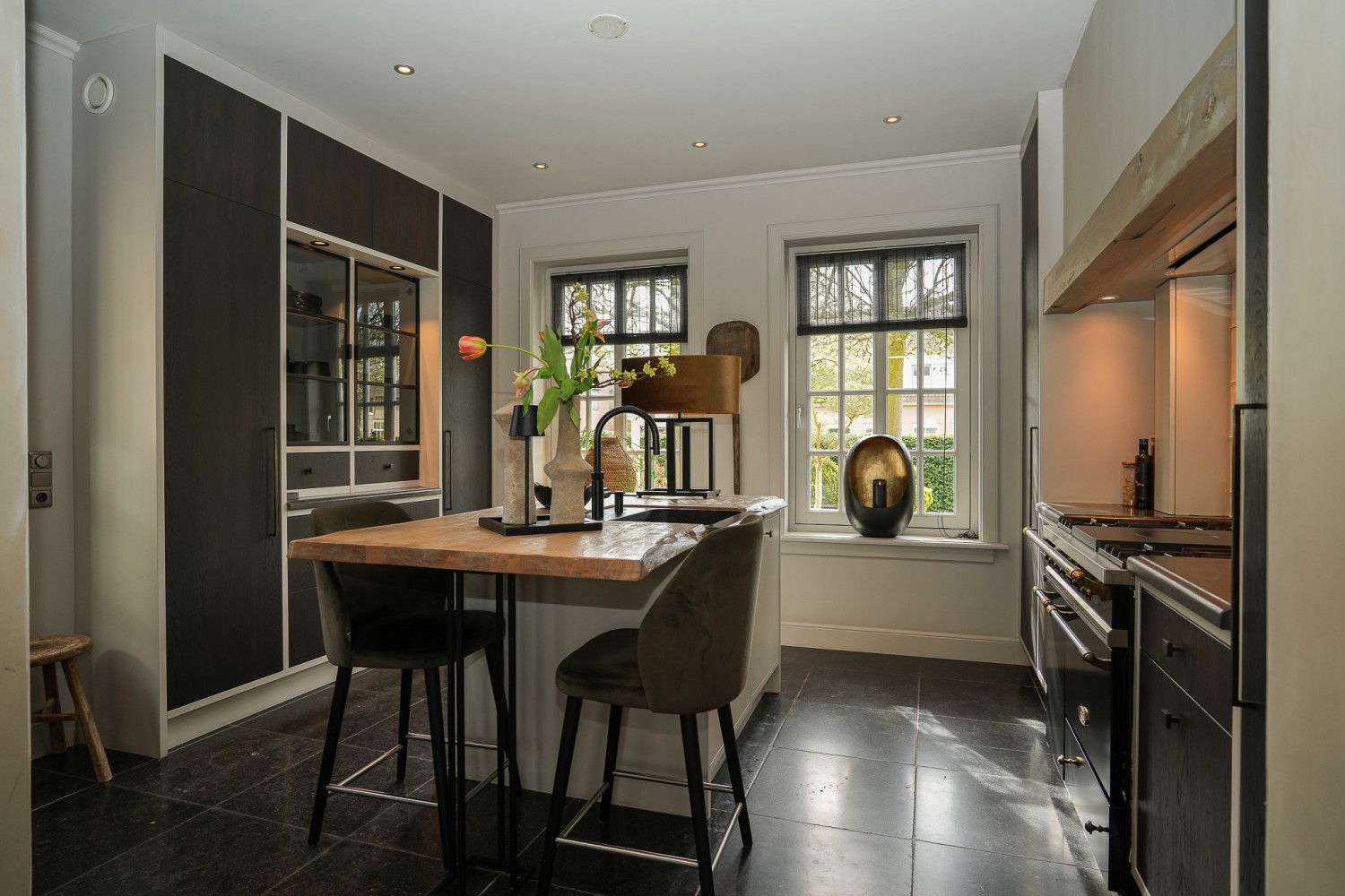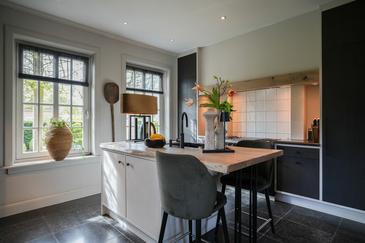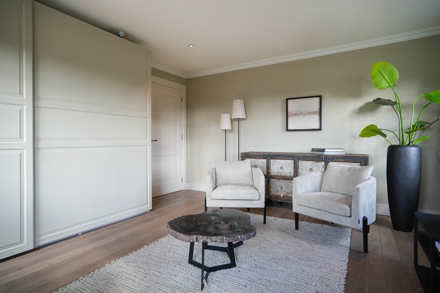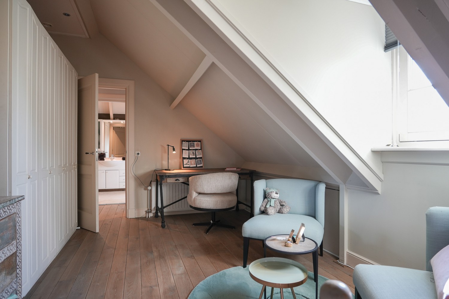 Binnen ervaart u een harmonie van licht en ruimte, waar authentieke details en eigentijds comfort elkaar versterken. De woonkamer met eiken vloerdelen en een zandstenen schouw met gashaard vormt het hart van het huis, terwijl toogramen aan de achterzijde het daglicht zacht binnenlaten. De eetkamer opent met grote deuren naar de tuin, wat het buitengevoel naar binnen brengt. De keuken is een stijlvolle plek met een hardstenen vloer, een eiland met eiken werkblad en hoogwaardige apparatuur. De master bedroom met inloopkast en luxe badkamer biedt een privé-oase met toegang tot een dakterras. Daarnaast is er een kantoorruimte met eigen entree, ideaal voor werk aan huis. Overal voelt u de zorgvuldige afwerking en het doordachte ontwerp dat het wonen hier bijzonder maakt.