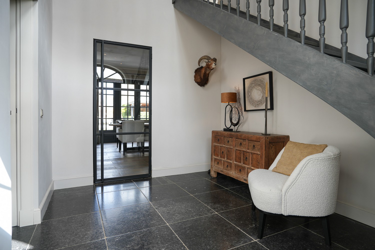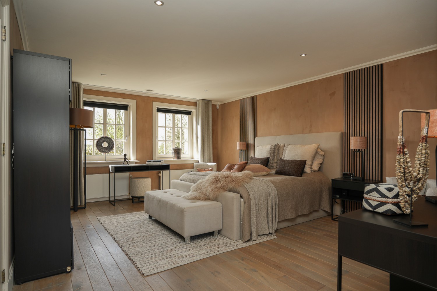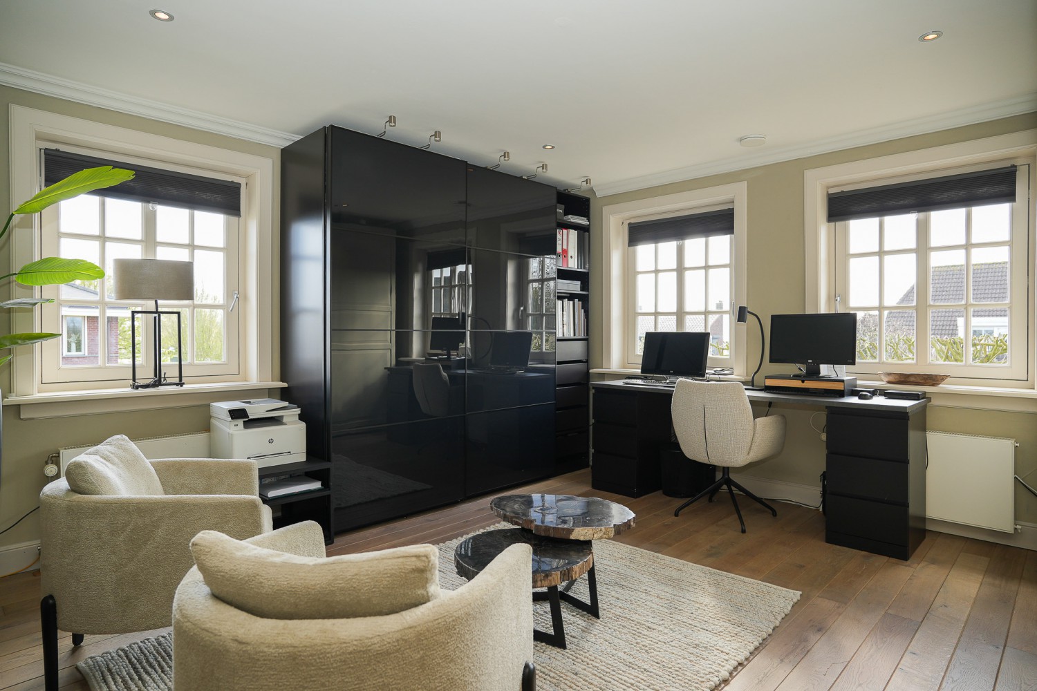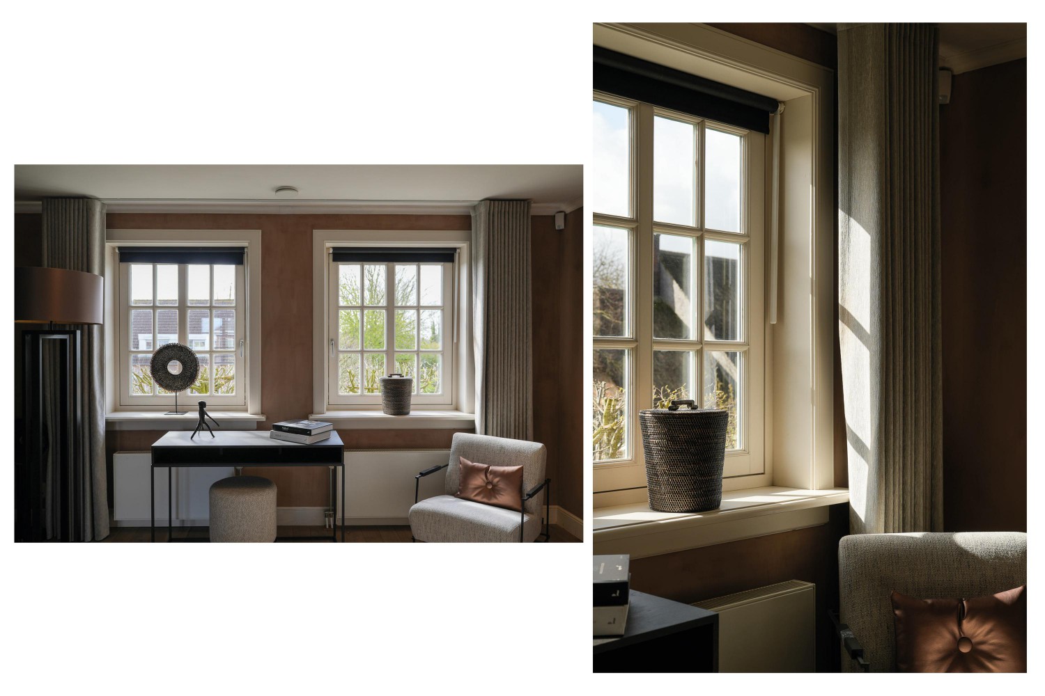 Binnen ervaart u een harmonie van licht en ruimte, waar authentieke details en eigentijds comfort elkaar versterken. De woonkamer met eiken vloerdelen en een zandstenen schouw met gashaard vormt het hart van het huis, terwijl toogramen aan de achterzijde het daglicht zacht binnenlaten. De eetkamer opent met grote deuren naar de tuin, wat het buitengevoel naar binnen brengt. De keuken is een stijlvolle plek met een hardstenen vloer, een eiland met eiken werkblad en hoogwaardige apparatuur. De master bedroom met inloopkast en luxe badkamer biedt een privé-oase met toegang tot een dakterras. Daarnaast is er een kantoorruimte met eigen entree, ideaal voor werk aan huis. Overal voelt u de zorgvuldige afwerking en het doordachte ontwerp dat het wonen hier bijzonder maakt.