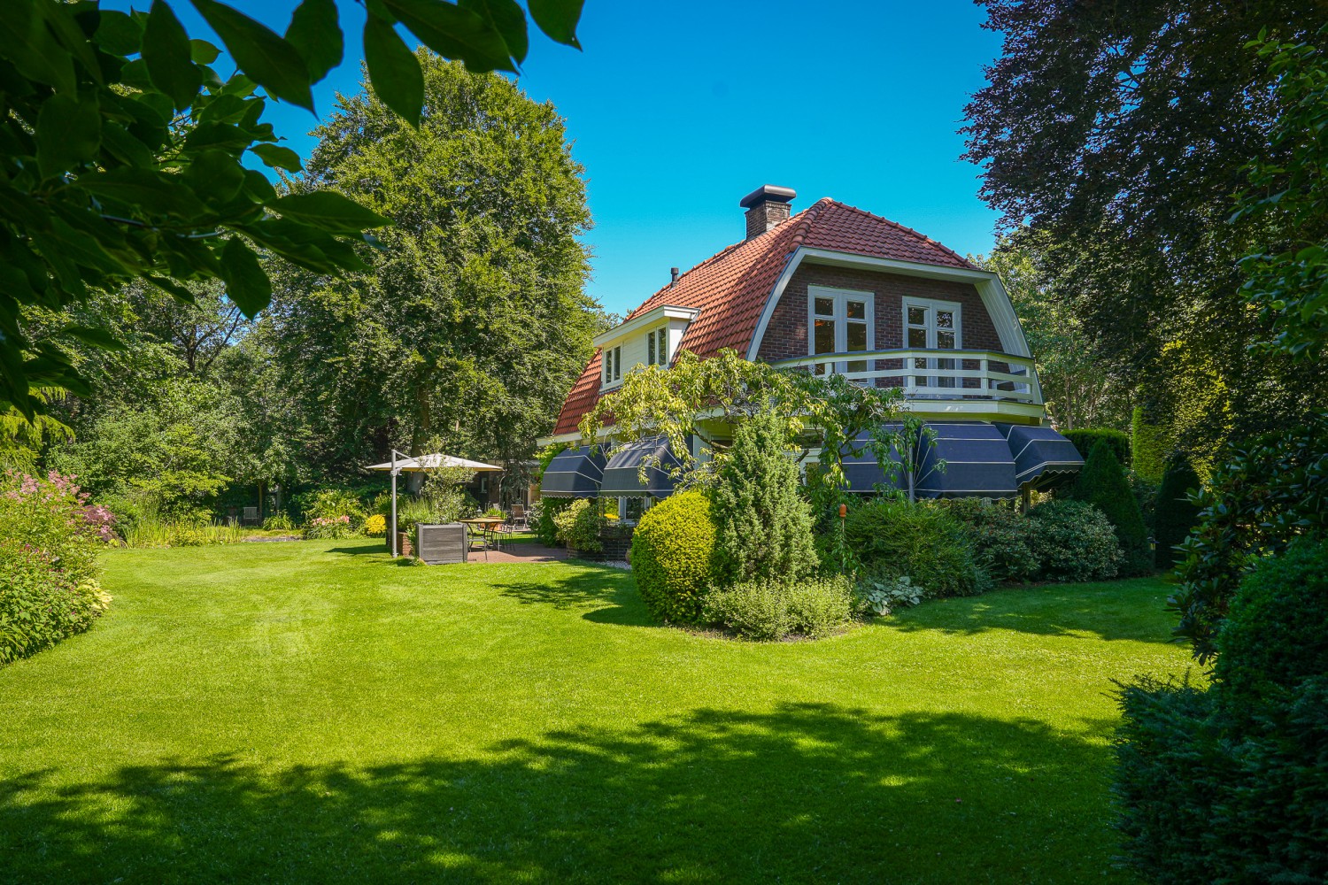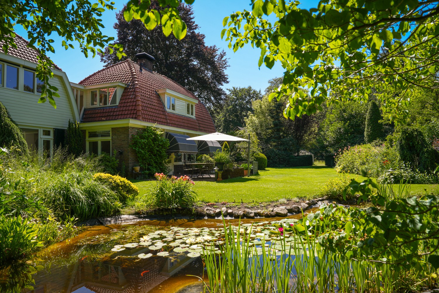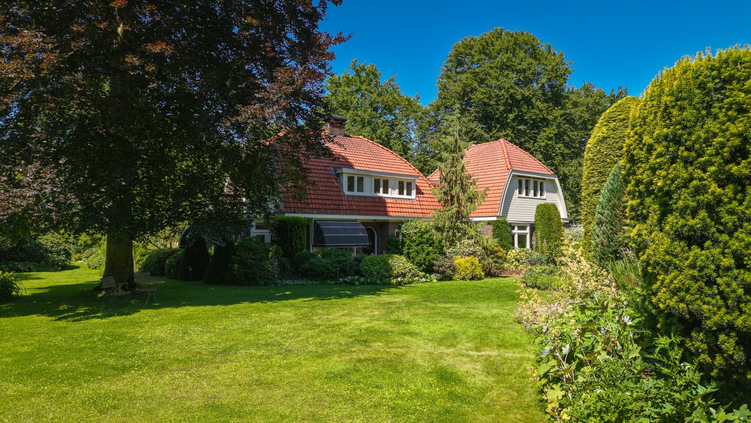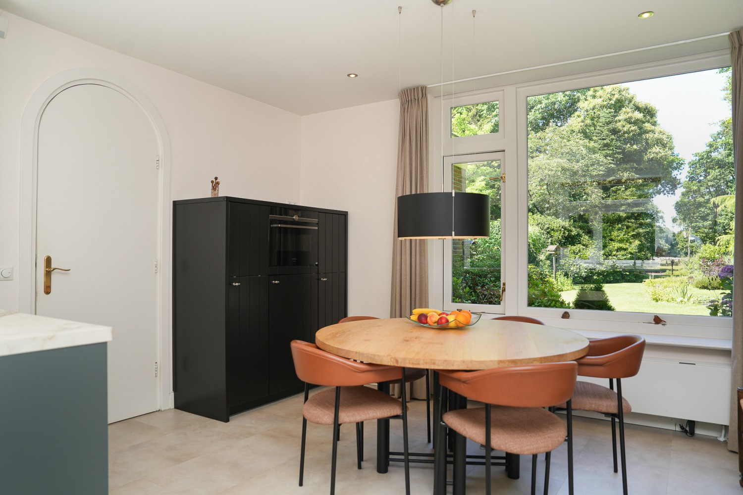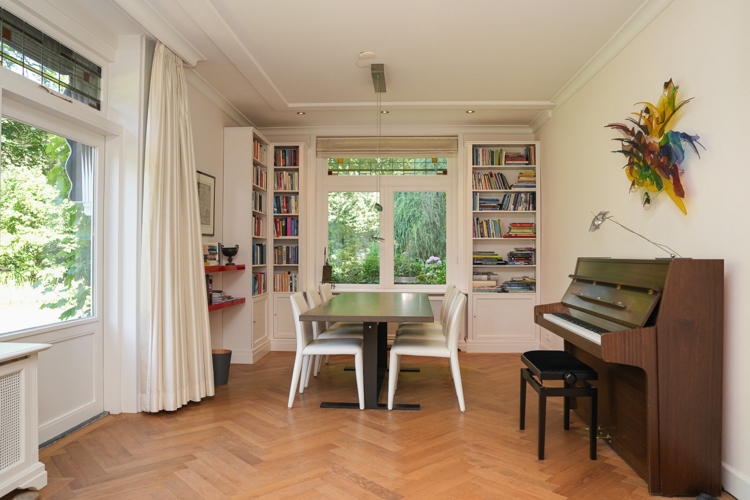 In het kloppend hart van de natuur ligt landgoed 'Het Rijssenseveld'. De Engelse landschapstuin die het landhuis uit 1934 omgeeft, is een walhalla voor de natuurliefhebber. Doorkijkjes, borders en een waterpartij met kwakende kikkers op een bed van waterlelies. Bovendien is het landgoed omgeven door een bosrijke omgeving. Bosdieren zoals reeën zijn uw naaste buren oftewel u geniet van maximale privacy. Met dit landhuis beleeft u elke dag het buitenleven. Diverse vertrekken zoals de woon- en eetkamer met serre, de keuken, de werk- en slaapkamer hebben ramen aan drie zijden, zodat u ook binnenshuis de wonderen van de natuur kunt aanschouwen. Zowel de tuin als de woning zijn perfect onderhouden. Het isolatie- en verwarmingssysteem is goed doordacht, ontworpen en uitgevoerd. De cv-ketel uit 2024 is tevens geschikt voor waterstof. De op maat gemaakte boekenkasten in de eet- en werkkamer sluiten naadloos aan op de lichte, open sfeer van het interieur. Bijzonder is ook de overloop met sluis naar de aanbouw op de verdieping. Door de vele raampartijen is de oversteek een groen panorama. En niet te vergeten de rust in de slaapkamer die thans in gebruik is als werkkamer. Die is niet te vangen in woorden, maar een must om te ervaren.